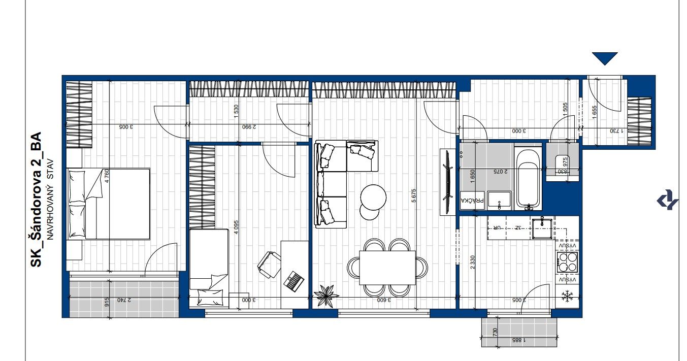 Byt má veľmi dobrú dispozíciu s veľkými priestormi pre vstavané skrine, neprechodné spálne, balkón z kuchyne, loggiu zo spálne, väčšiu kúpeľňu s vaňou, priestorom na práčku a sušičku a samostatné WC.