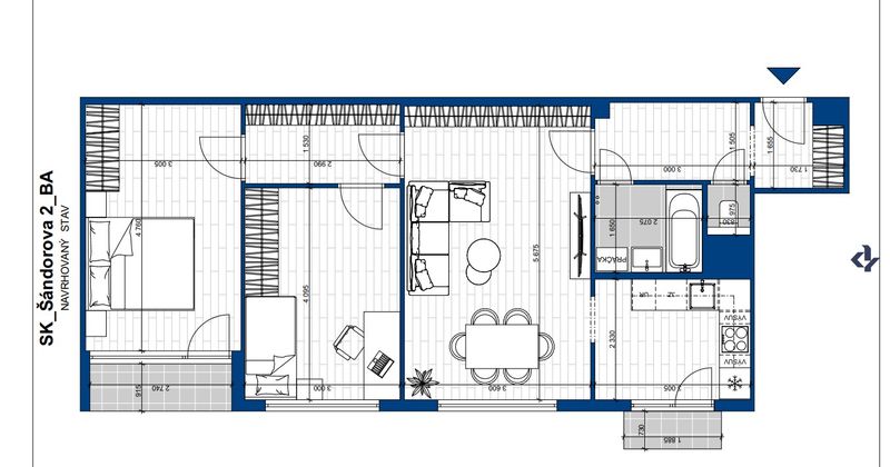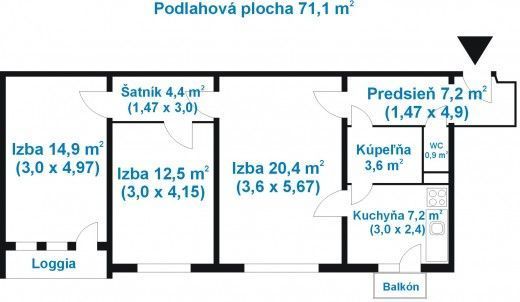 Situovaný je na 5 poschodí v 8 poschodovom zateplenom bytovom dome, k bytu prislúcha priestranná murovaná pivnica v suteréne. Úžitková plocha bytu je 71,1 m2 pivnica má výmeru 2 m2, balkón 1,5m 2 a loggia 3 m2.