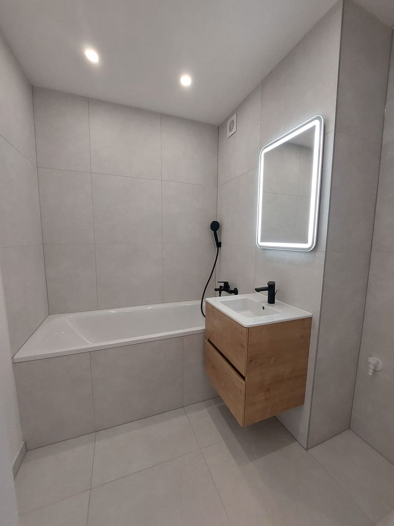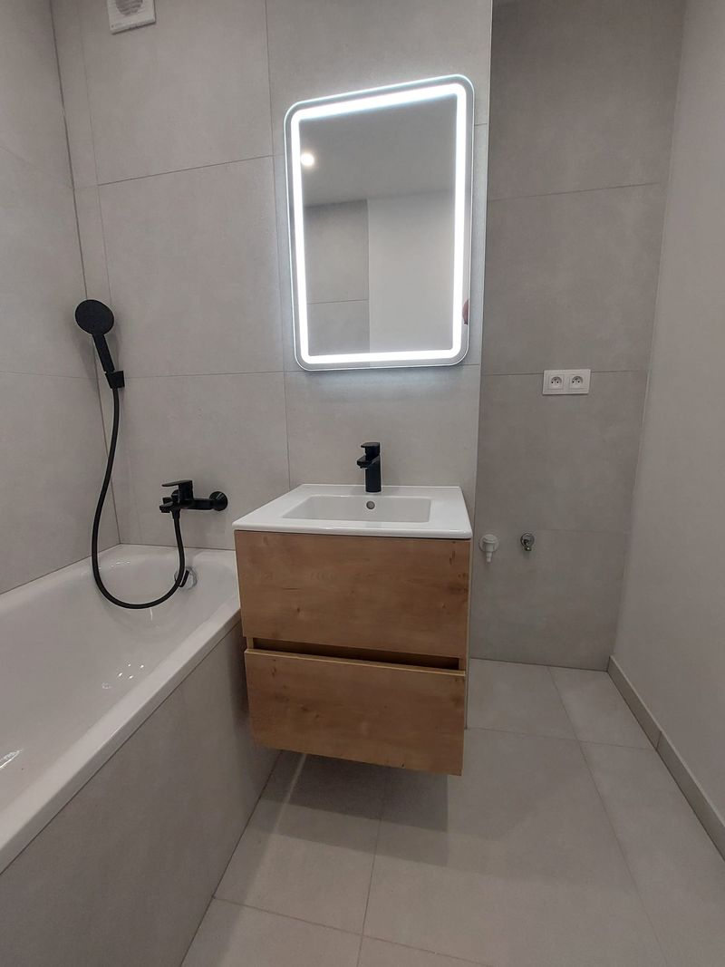 - nová kúpeľňa a WC, nemecké batérie a vaňa, WC závesné, soft close sedátko, rektifikované veľkoplošné obklady a dlažby, umývadlo so skrinkou a zrkadlom s osvetlením, priestor pre práčku a sušičku