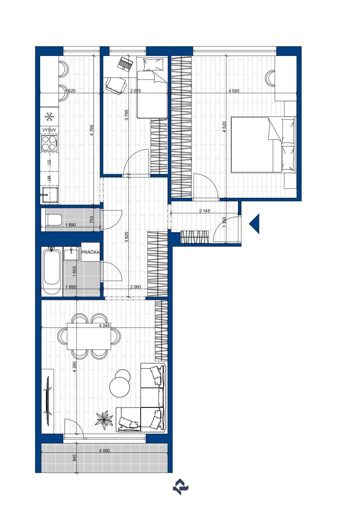 Praktická dispozícia bytu s priestrannou obývacou izbou, veľkou spálňou s výstupom na zasklenú loggiu, menšou spálňou, kuchyňa, kúpeľňa, samostatné WC, predsieň a priestranná hala. Orientovaný je na dve svetové strany východ-západ.