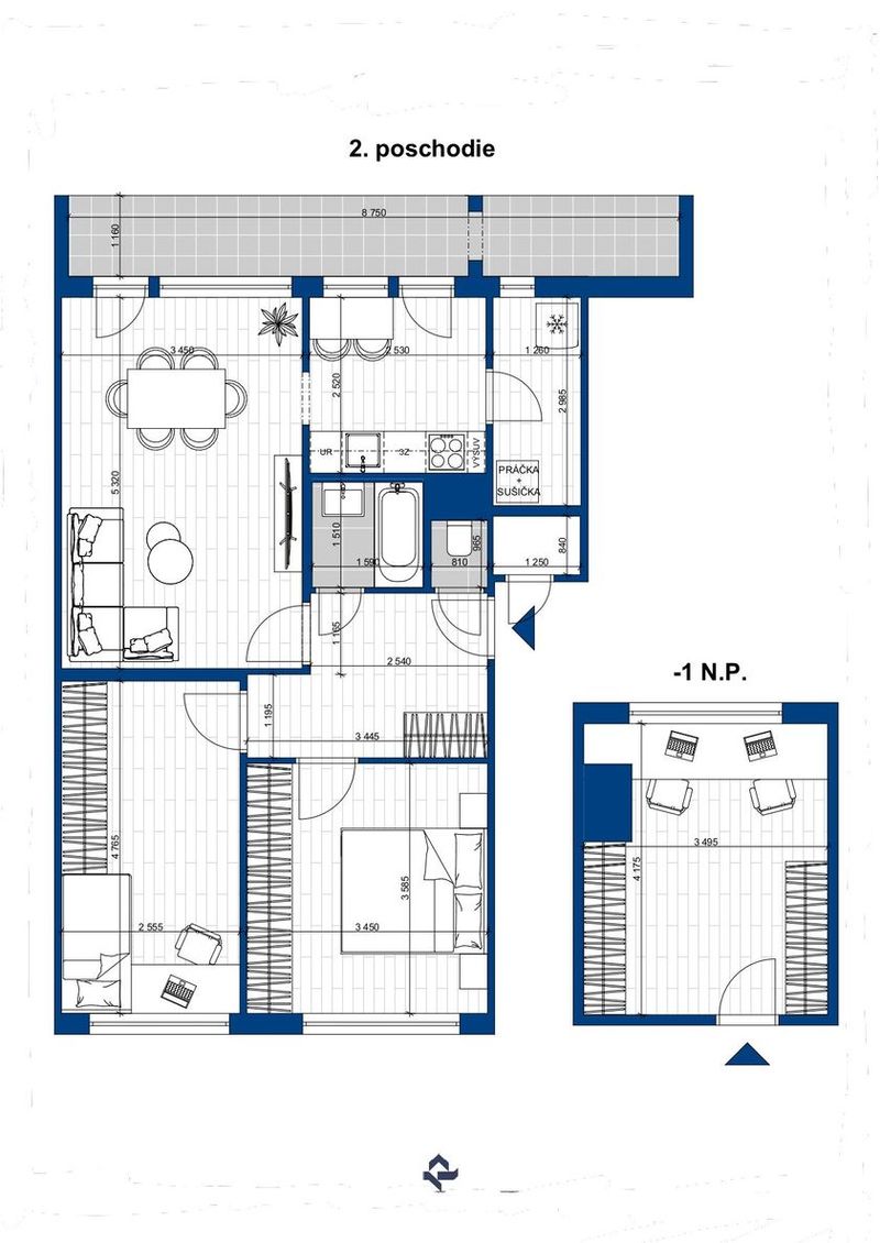 Situovaný je na 1. poschodí (2NP – pod bytom je byt na prízemí) v 4 poschodovom zateplenom bytovom dome. Úžitková plocha bytu je 89m2 (byt 64,45m2 + miestnosť 14,60m2 + loggia 10,05 m2).