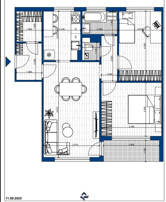 Dispozícia bytu: 3x samostatná izba, kuchyňa, kúpeľňa, samostatné WC s umývadlom, šatník, veľká loggia