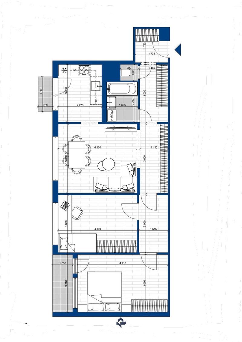 Byt má veľmi dobrú dispozíciu so samostatným WC a kuchyňou s balkónom, veľká obývacia izba a dve neprechodné spálne. Z rodičovskej spálne je výstup na zateplenú, zasklennú loggiu.